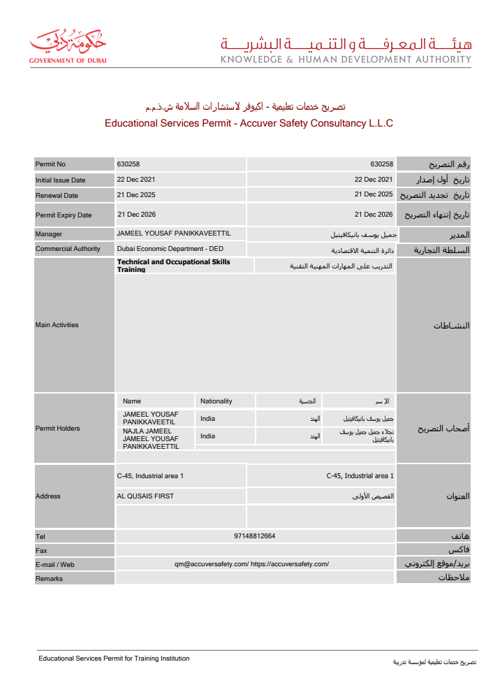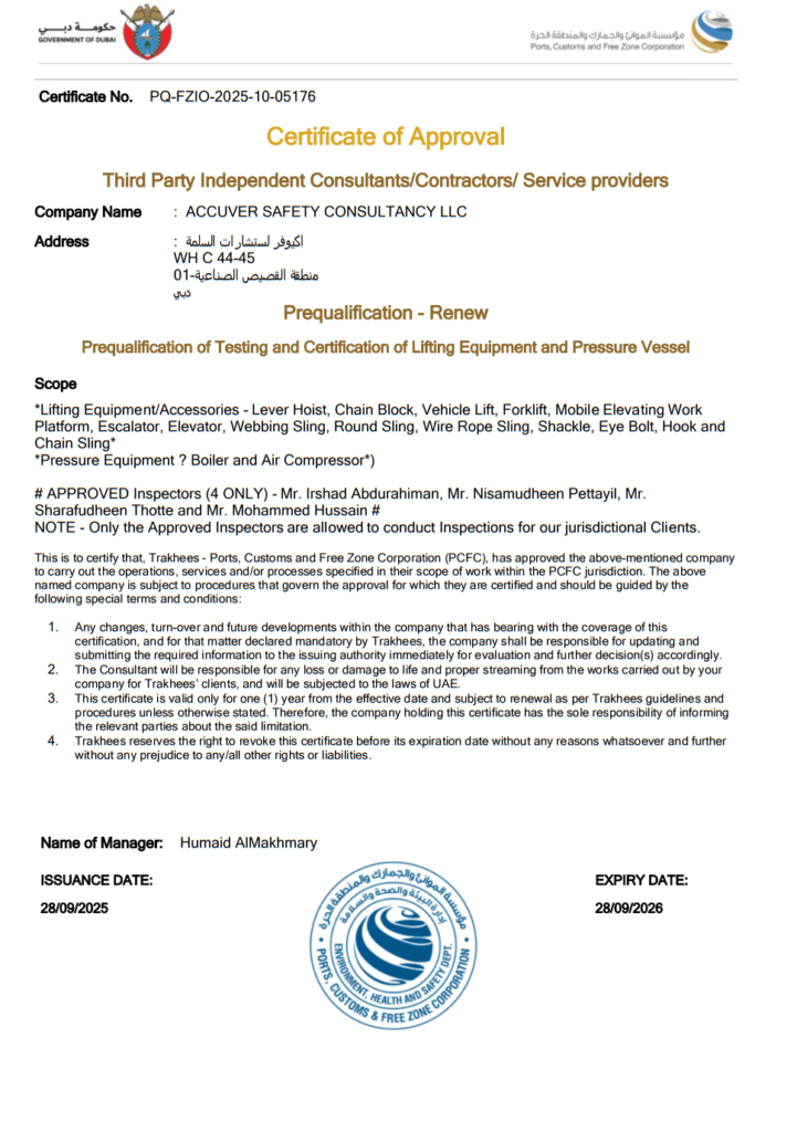 Welcome to ASCO (Accuver Safety Consultancy LLC.), a division of Accuver Group, distinguished provider of third-party safety inspection & certification, Safety Training services, proudly operating in strict accordance with the ISO 17020 standard and ElAC(Emirates International Accreditation Center:lB-222). With an unwavering commitment to safety, precision, and compliance, we are your trusted partner in ensuring that safety remains a paramount priority across industries.